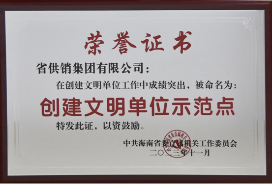 ☉海南省供銷集團(tuán)獲評省直機(jī)關(guān)工委“創(chuàng)建文明單位示范點”榮譽稱號 12月28日,中共海南省委直屬機(jī)關(guān)工作委員會頒發(fā)《創(chuàng)建文明單位示范點》榮譽證書,海南省供銷集團(tuán)獲評為創(chuàng)建文明單位示范點單位。 海南省供銷集團(tuán)在省社黨組的堅強(qiáng)領(lǐng)導(dǎo)和省社機(jī)關(guān)黨委的指導(dǎo)下,堅持以習(xí)近平新時代中國特色社會主義思想為指導(dǎo),始終把黨的建設(shè) 日期:2023.12.28 點擊:224