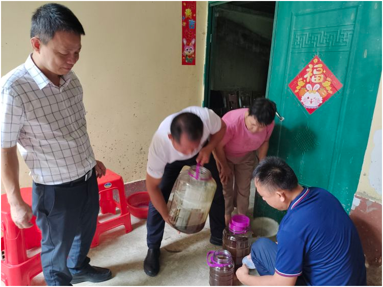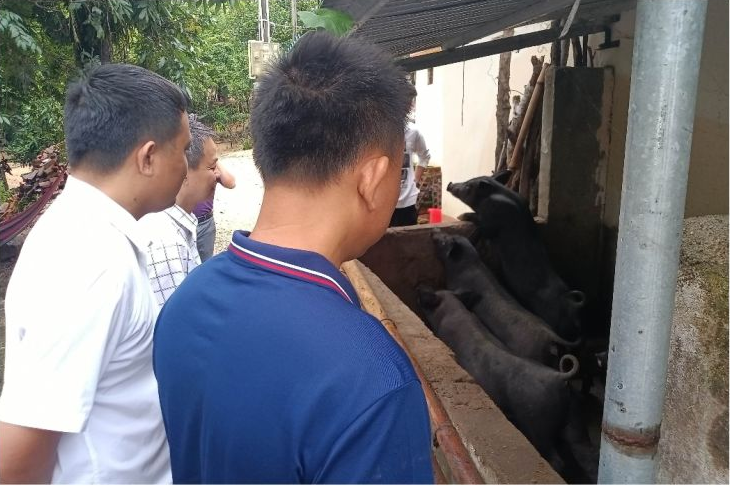那門(mén)村小組脫貧戶吉明進(jìn)反饋計(jì)劃出售自家養(yǎng)的仔豬,走訪組一行又來(lái)到其養(yǎng)殖基地查看仔豬情況。摸清數(shù)量和農(nóng)戶銷(xiāo)售價(jià)格后,育才供銷(xiāo)社主任黃文全幫助其建立起對(duì)接銷(xiāo)售渠道。