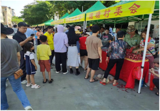 活動共設(shè)立30個攤位,銷售產(chǎn)品主要來自脫貧戶、帶貧企業(yè)、農(nóng)產(chǎn)品生產(chǎn)基地、種養(yǎng)大戶、農(nóng)民專業(yè)合作社等提供的優(yōu)質(zhì)鮮活農(nóng)產(chǎn)品。攤位上擺滿了新鮮采摘的水果,如蓮霧、椰子、榴蓮蜜、荔枝等,還有村民自家養(yǎng)殖的雞、鴨、鵝等畜類,就連海鮮、雜糧等商品都一應(yīng)俱全。大家購買熱情高漲,現(xiàn)場氣氛熱鬧、交易活躍。