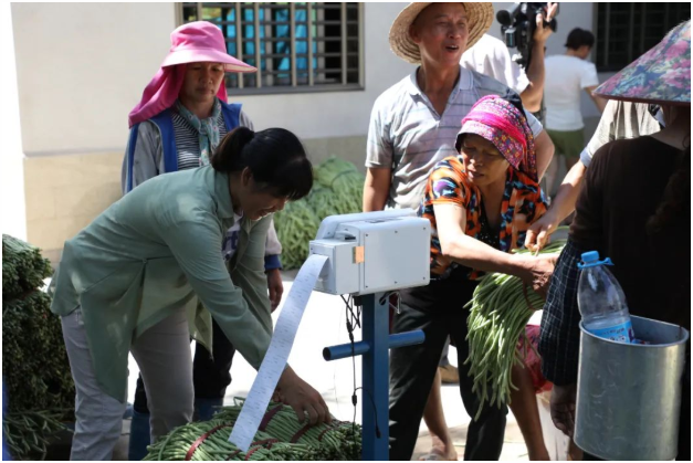 ▲農(nóng)戶將采摘的蔬菜運輸?shù)竭^秤點