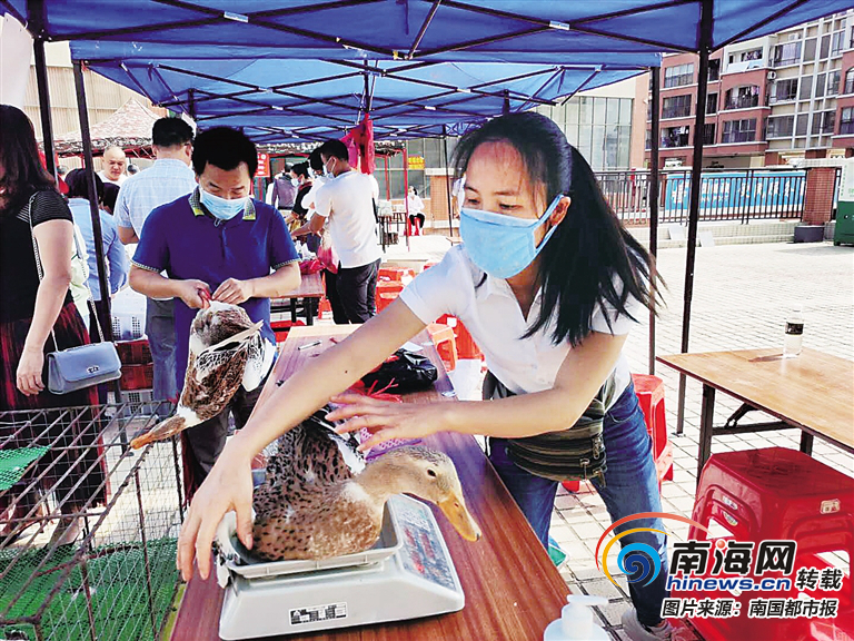 在白沙消費扶貧活動現(xiàn)場,攤主給顧客選購的鴨稱重。梁振文 攝